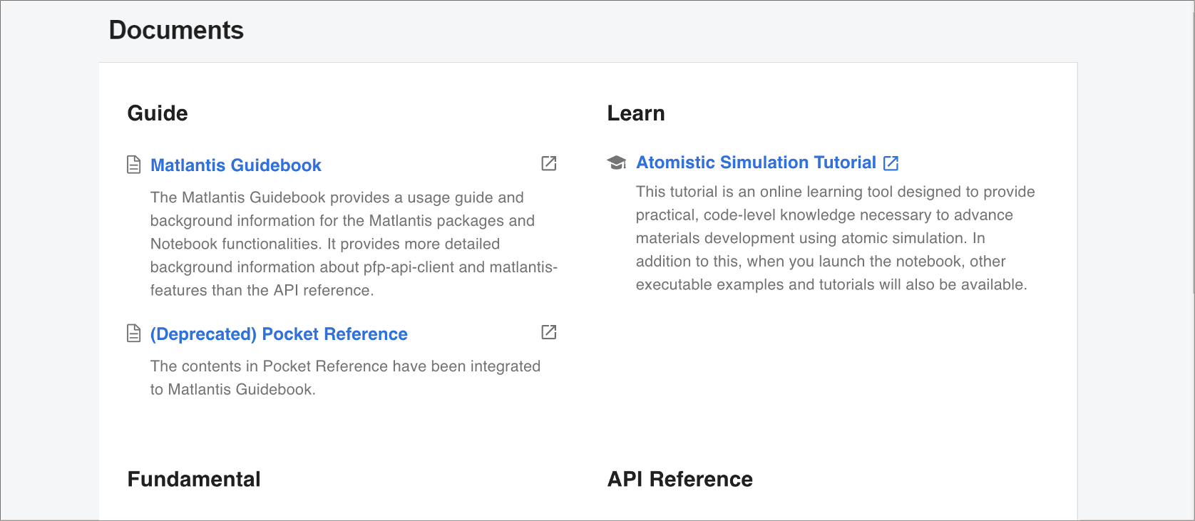 Documents tab provides documentation such as guidebooks, manuals, tutorials, and references. The documents can also be accessed from the Notebook env. > Basic Launcher.