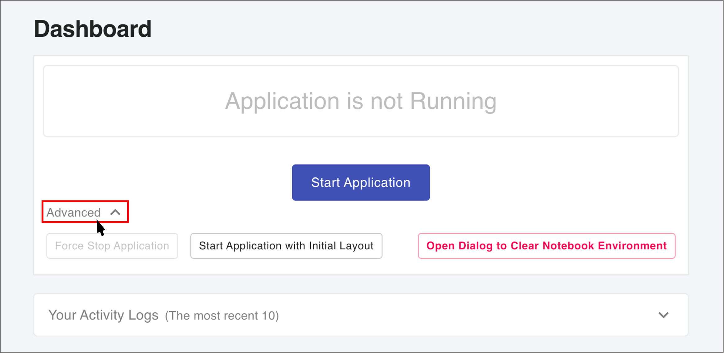 - "Restart Application": It can be executed from the right ▼ of Stop Application and will restart the notebook environment. See also the next section for more information on restarting