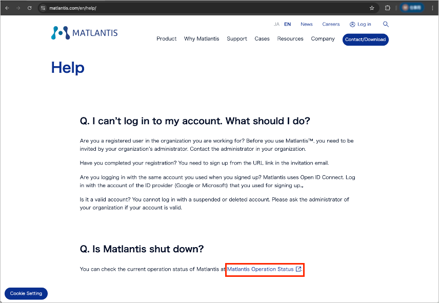 It can also jump from Our official site > Help(the bottom of page) > “Matlantis Operation Status”
