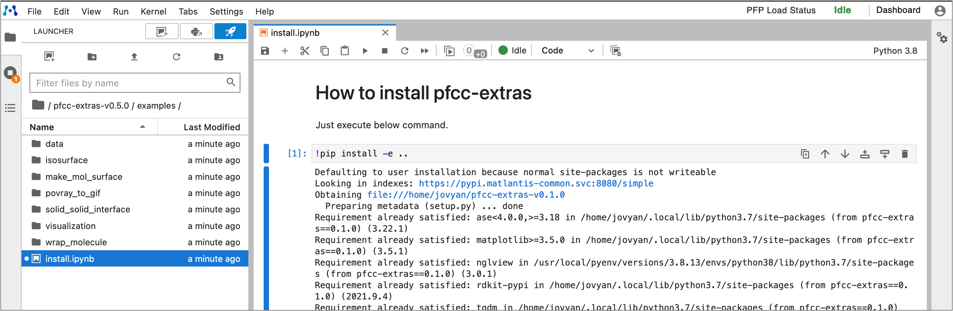 - Open the file "/pfcc-extras-v0.x.0/examples/install.ipynb" and execute the following cells