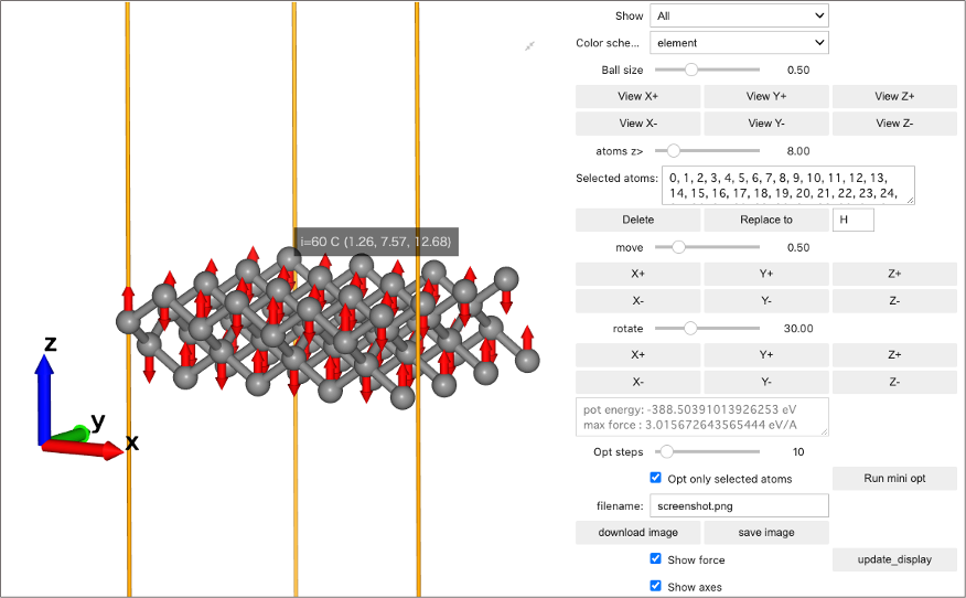 - Displays atom ID and coordinates (w/Hovering mouse cursor over an atom)