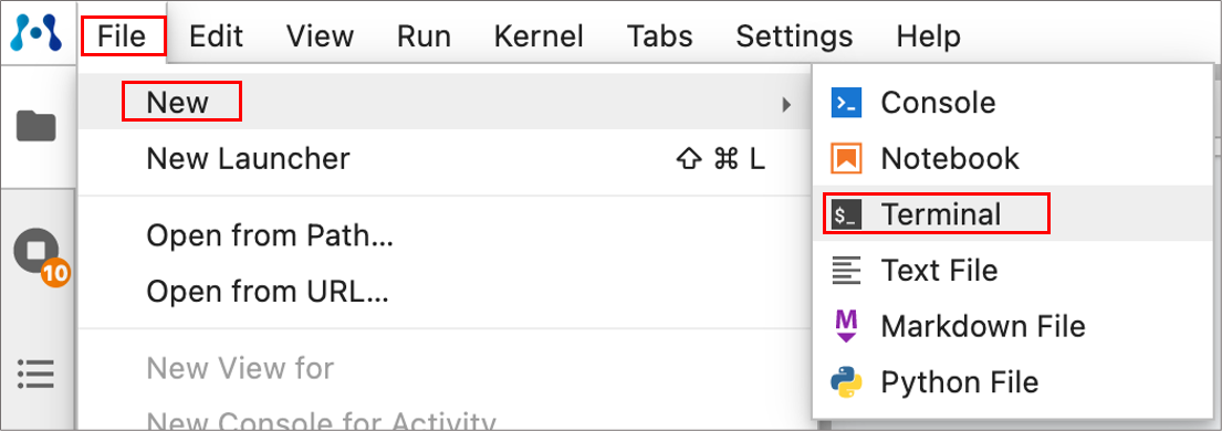 To open a terminal in the Matlantis environment, open it from File > new > Terminal as follows. Once the terminal is open, you can run pip by activating the Python environment. (See here for instructions on how to activate the Python environment here.)