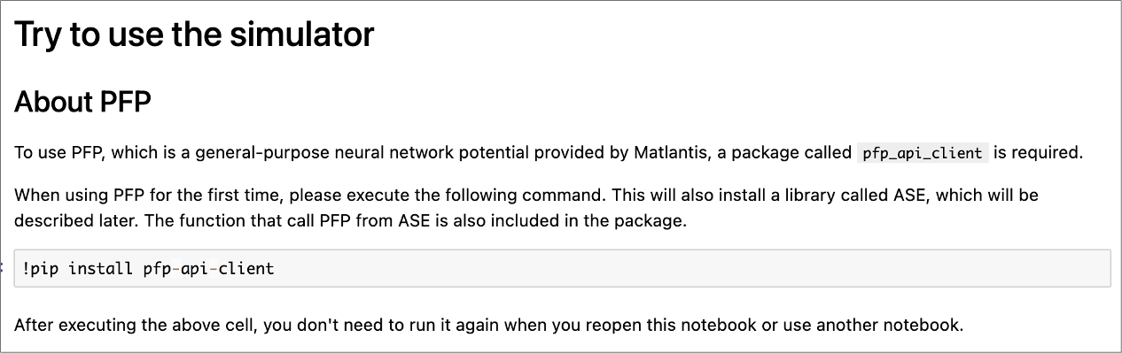 To use Maltantis' general-purpose neural network PFP (Preferred Potential), first install a package for using PFP, including an ASE called pfp-api-client.