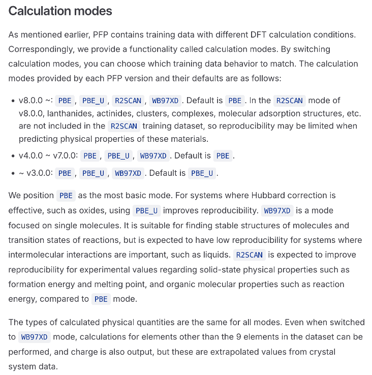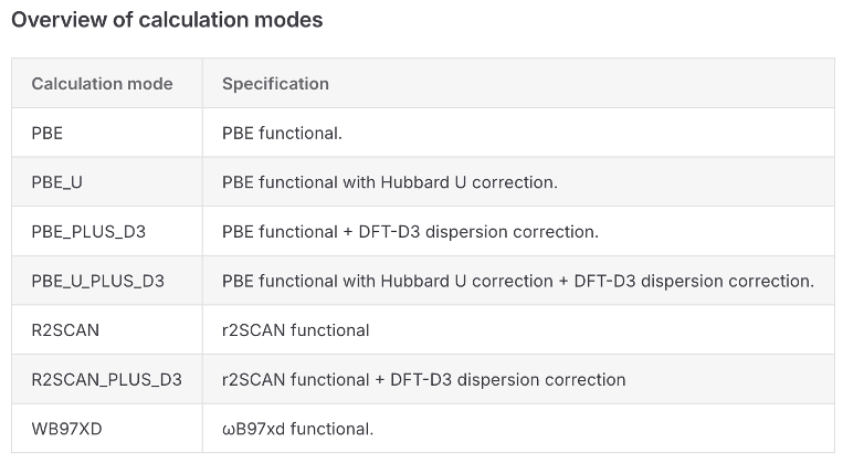 - The default and available calculation modes vary depending on the version (PBE_U is the default up to v3.0.0, and PBE is the default from v4.0.0 onwards). We recommend explicitly specifying both the calculation mode and the version when using them (please refer here for instructions on how to specify both the calculation mode and the version simultaneously).