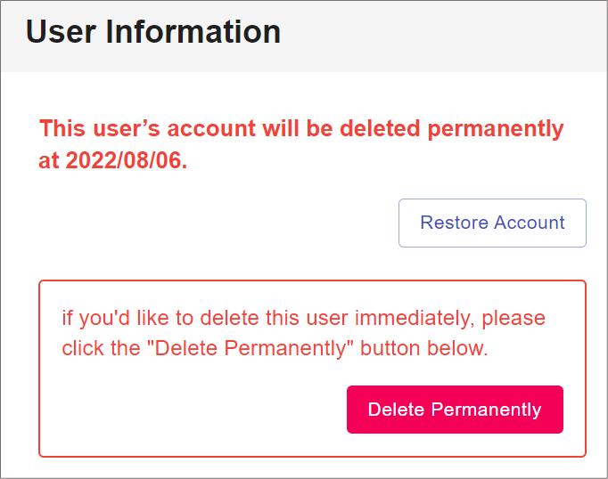 - The operation can be cancel by clicking "Restore Account" in User Information view, within this 30 days.