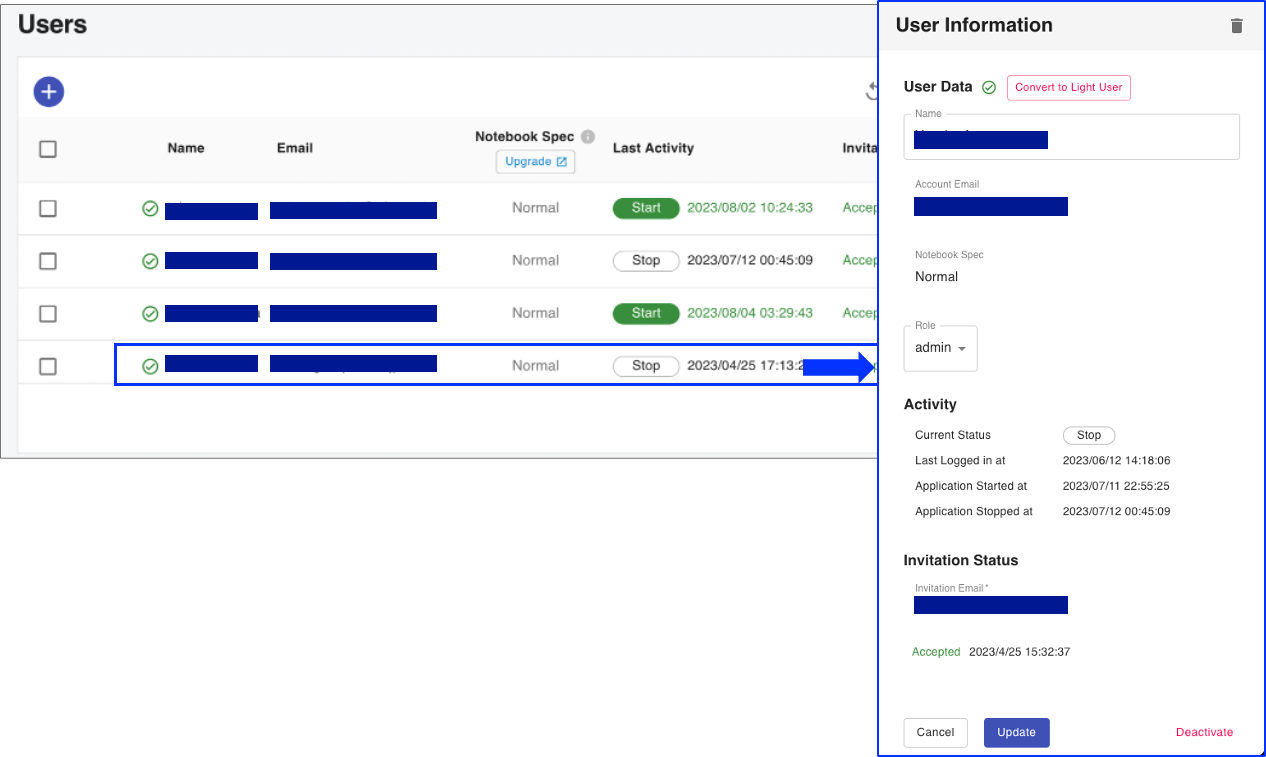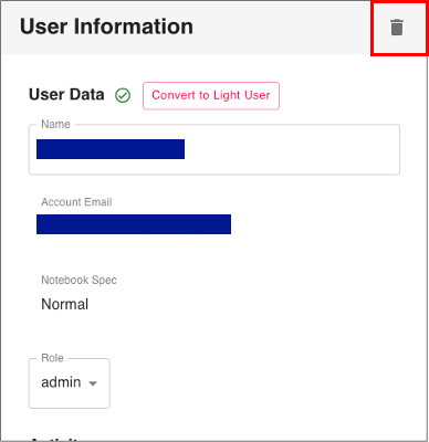 #Note: Once a user account is deleted, it cannot be restored. - Deactivate: the user will not be able to log in. Data and environment will be maintained and the number of users will not change.