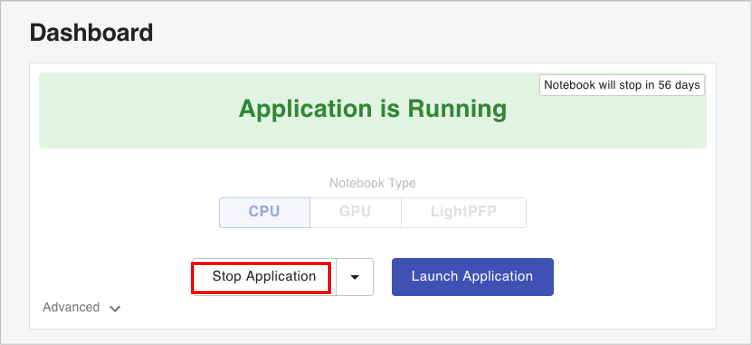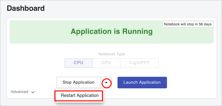 ("Restart Application" performs the same process as stopping Matlantis in "Stop Application" and starting Matlantis in "Start Application", with one click.)