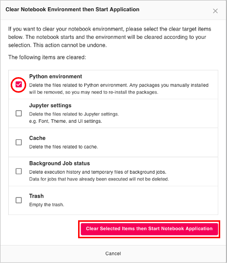 - Select "Open Dialog to Clear Notebook Environment".