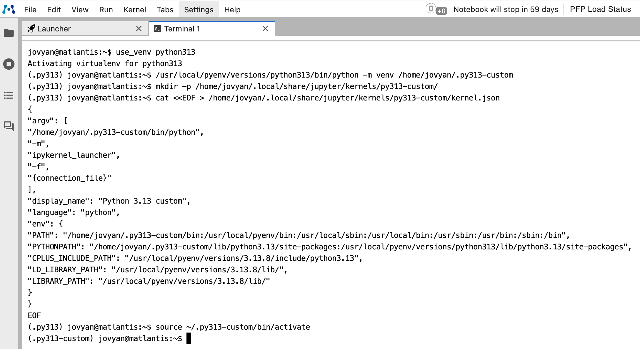 /usr/local/pyenv/versions/python313/bin/python -m venv /home/jovyan/.py313-custom2. Configuration to Display the Kernel in Jupyter Lab