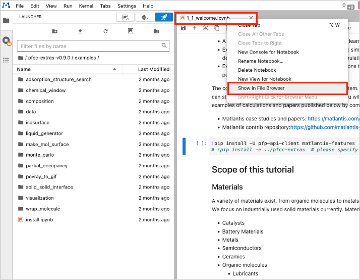 - Right-click on the file name and click "Show in File Browser"(at this time, the File Browser is displaying a different location than where the notebook is located).