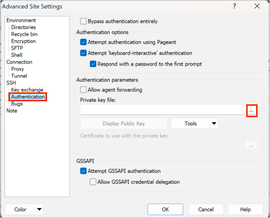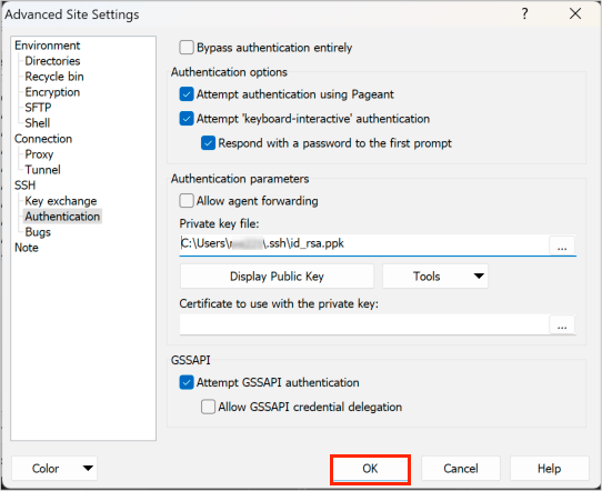 - The screen showing the ppk file setup looks as follows. Close the Advanced Site Settings screen by clicking the OK button.