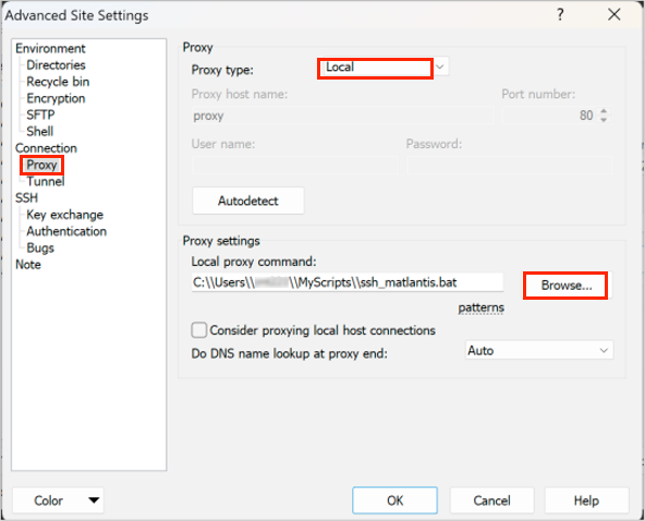 For Local proxy command, specify "ssh_matlantis.bat" using "Browse" button.