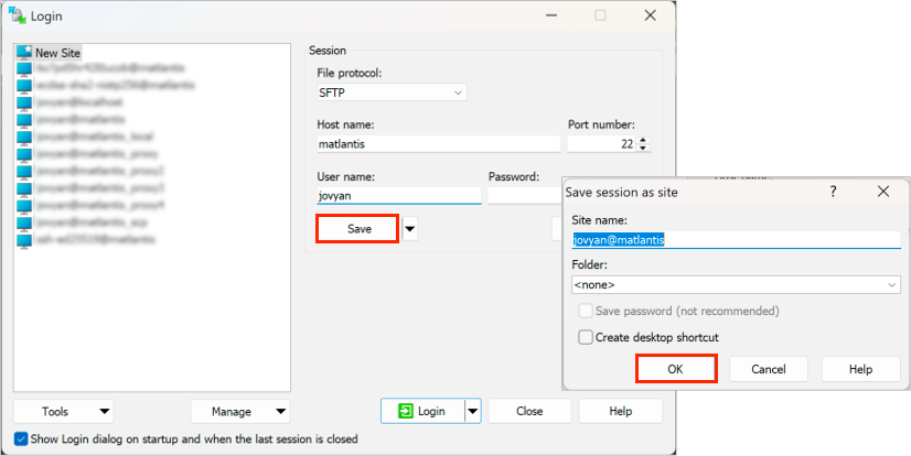 Select the saved session and connect by clicking "Login".