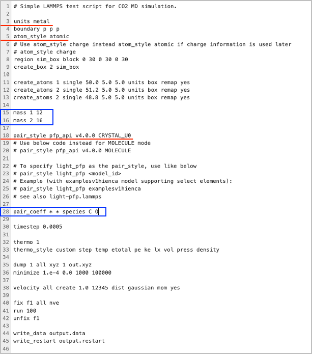 - Typically, LAMMPS requires a "data" file in addition to the "in" file. However, when using PFP, the settings for bonds, angles, dihedrals, and impropers, which are typically listed in the data file for classical force fields, are not needed. Therefore, "mass" and "pair_style" are specified in the "in"file. Of course, it is also possible to set "mass" and "pair_style" in the "data" file and execute without any issues.
