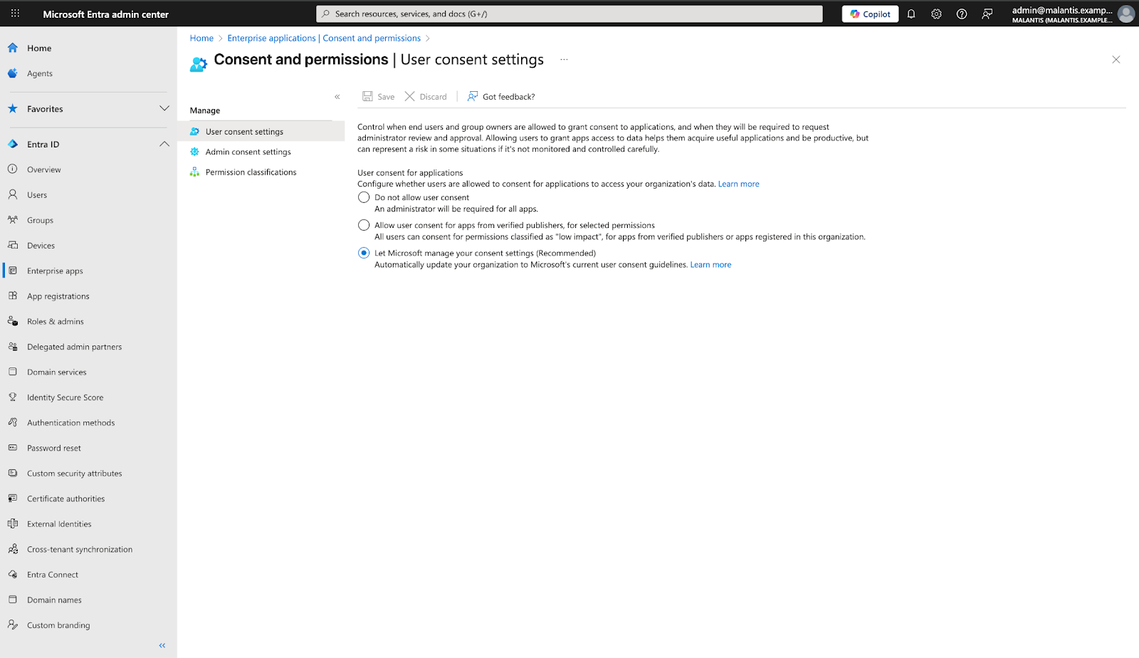 From Microsoft Entra admin center sidebar, check Enterprise apps > Consent and permissions > User consent settings.