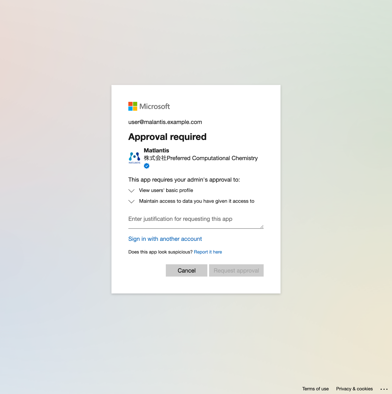Matlantis users will see a screen like this when signing up. Please review the "This app would like to", and if there are no problems, enter a reason and click [Request approval].