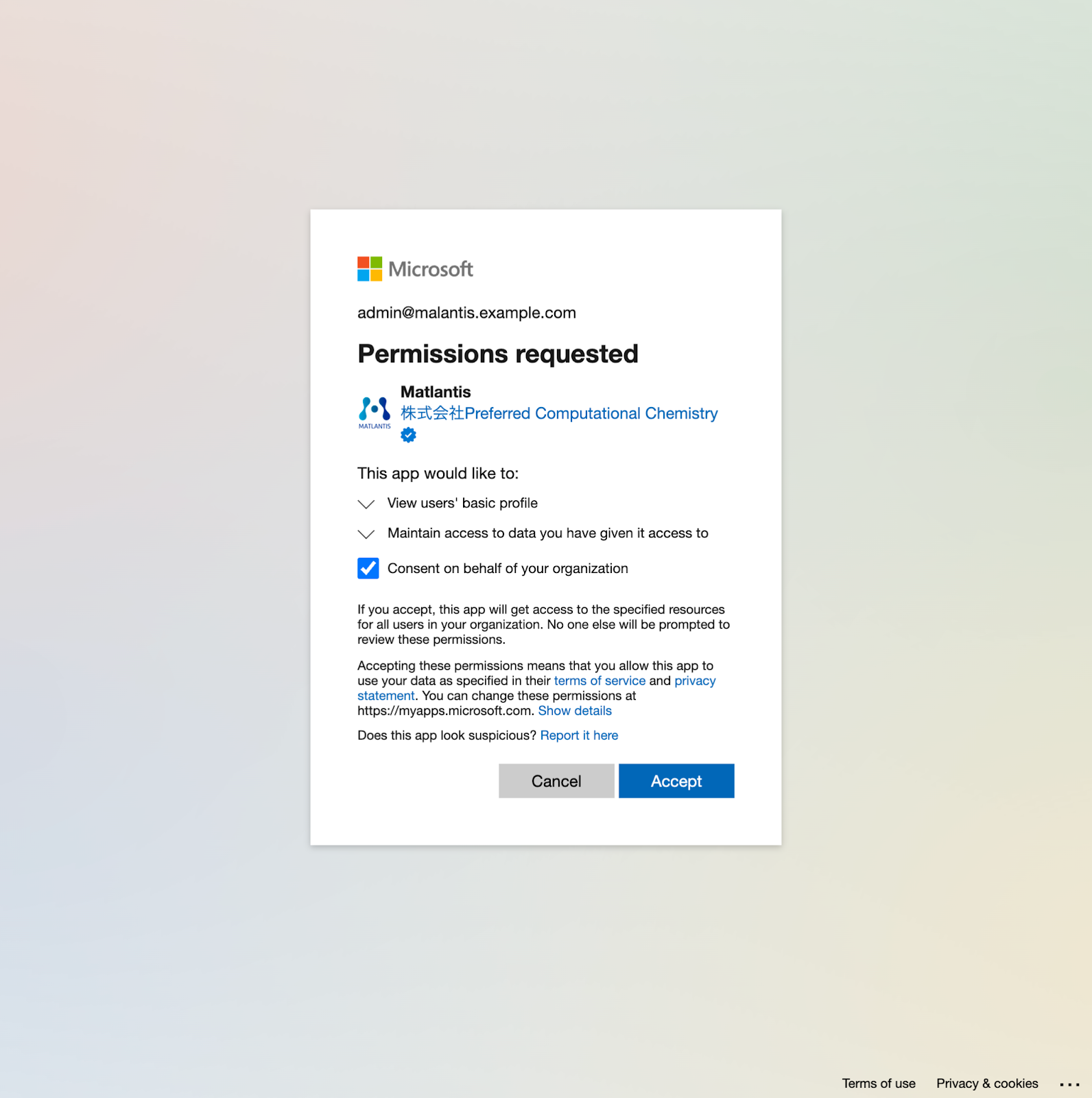 When logging into Matlantis using Entra ID, you'll need to allow Matlantis' registered application on your Entra ID account. You don't need to create or register applications on your Entra ID yourself.