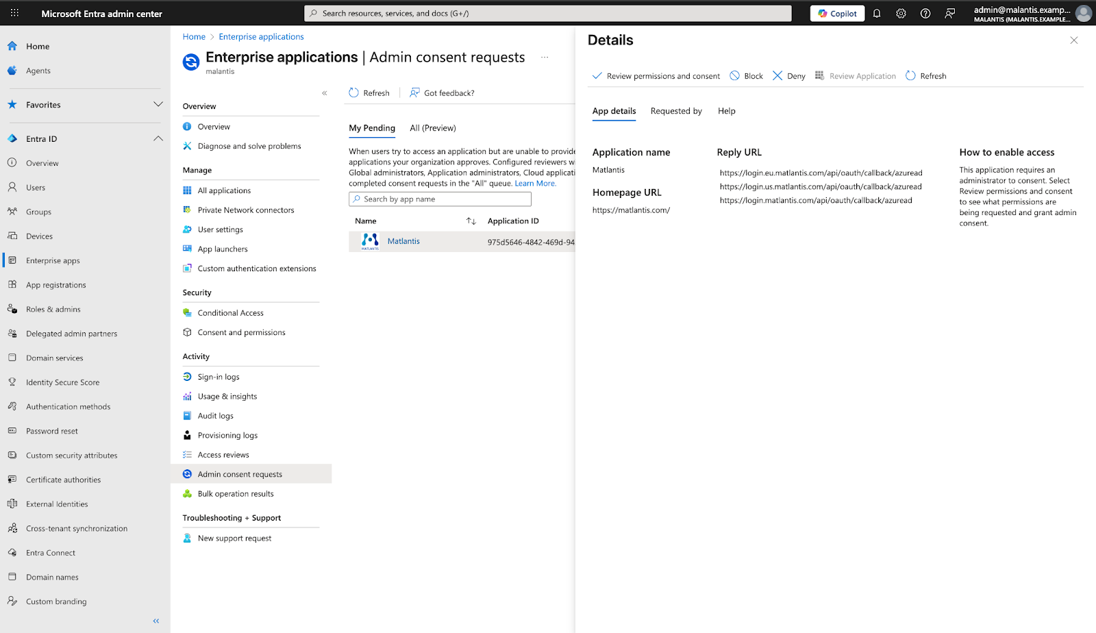 Select Matlantis and choose "Review permissions and grant consent" to perform admin consent.