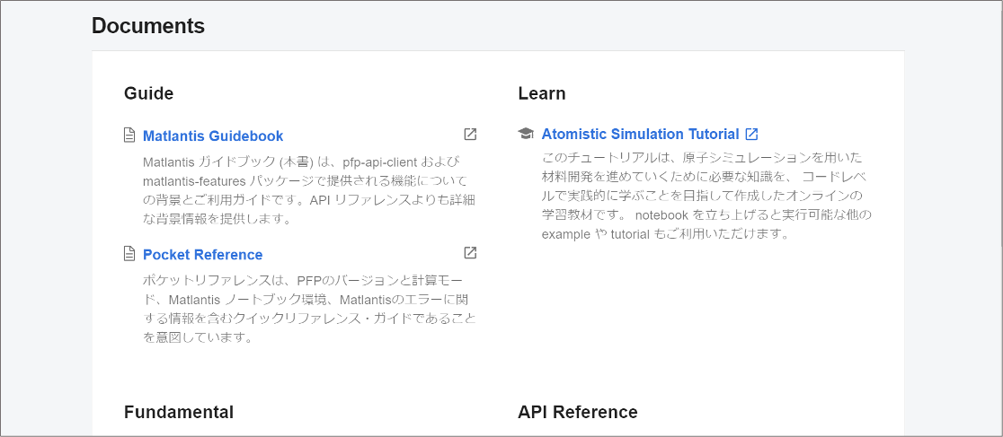 Documents ではガイドブック、解説書、チュートリアル、リファレンス等のドキュメント類を提供します。ドキュメントは Notebook 環境 > Basic Launcher からもアクセスできます。