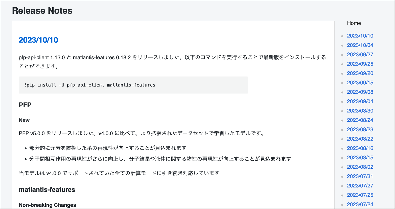 Release Notes では機能やシステムに関する更新情報を時系列で確認できます。