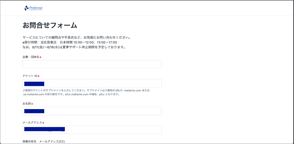 なお、お問い合わせは、本サービスのユーザーに限り、契約書に記載された利用期間に限ります。