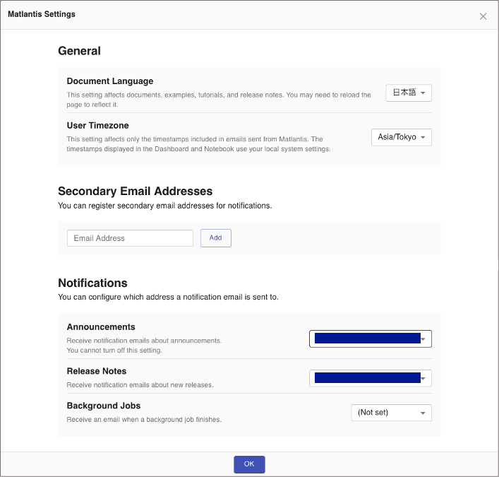 - Background Jobs:バックグラウンドジョブの終了を通知します。必要な場合設定します(デフォルト:Not set)