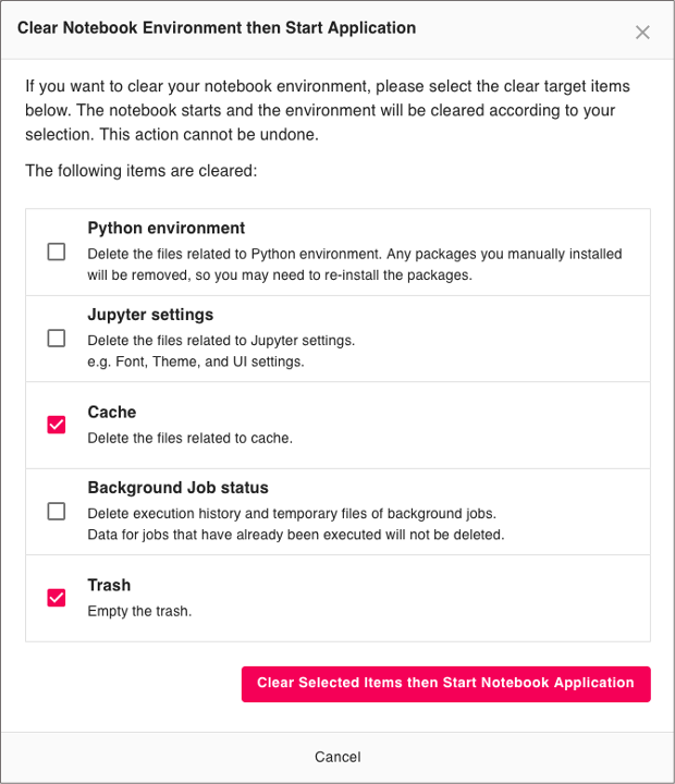 “Open Dialog to Clear Notebook Environment”:ノートブック環境の設定をクリアします。