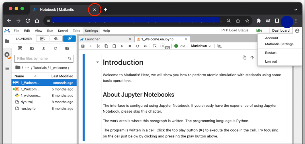 ※「Notebook will stop in 59 days...」については、「Matlantis のシャットダウン条件」をご確認ください。60日間の強制的なシャットダウンまでカウントダウンします。