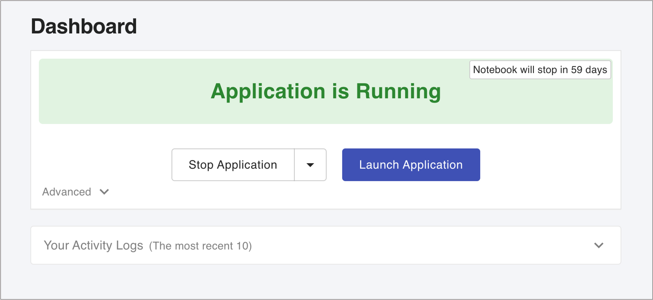 - "Restart Application": "Stop Application" の右にある▼から実行可能で、ノートブック環境の再起動を再起動します。(再起動については 次項 もご確認ください。)