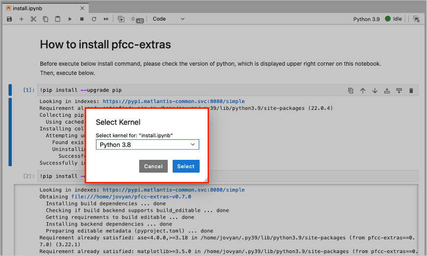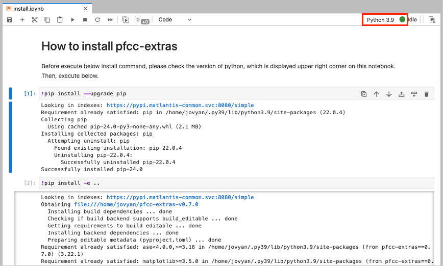 対処療法的にはなりますが、Python 3.9 のみならず、Python 3.8 環境でも pfcc-extras v0.7.0 をインストールするとエラーが解消しますので、install.ipynb のカーネルを変更してPython 3.8 および 3.9 の両方でインストールを実行してください。(根本的な解決方法についても調査中です)