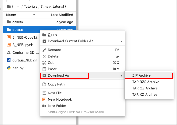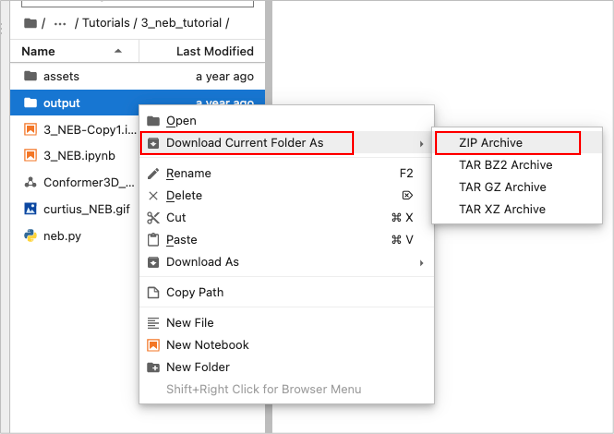 選択しているファイルがあるフォルダー(下図でいうと 3_neb_tutorial )をZIPフォルダで保存します。