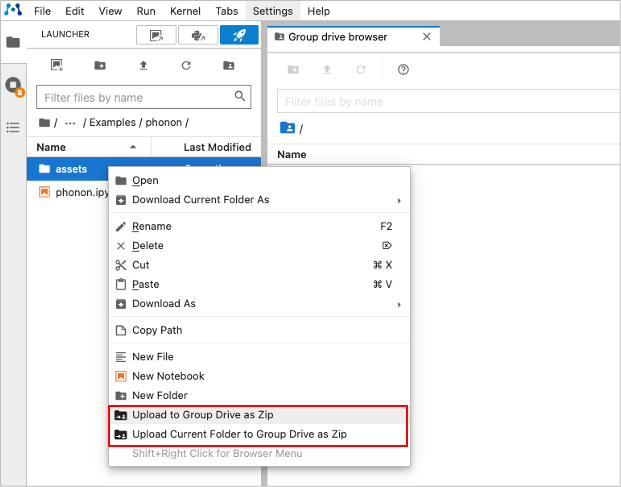 - 右クリックメニュー > Upload to GroupDrive as Zip または Upload Current Folder to Group Drive as Zip(最初にGroupDrive を開かないと表示されません)