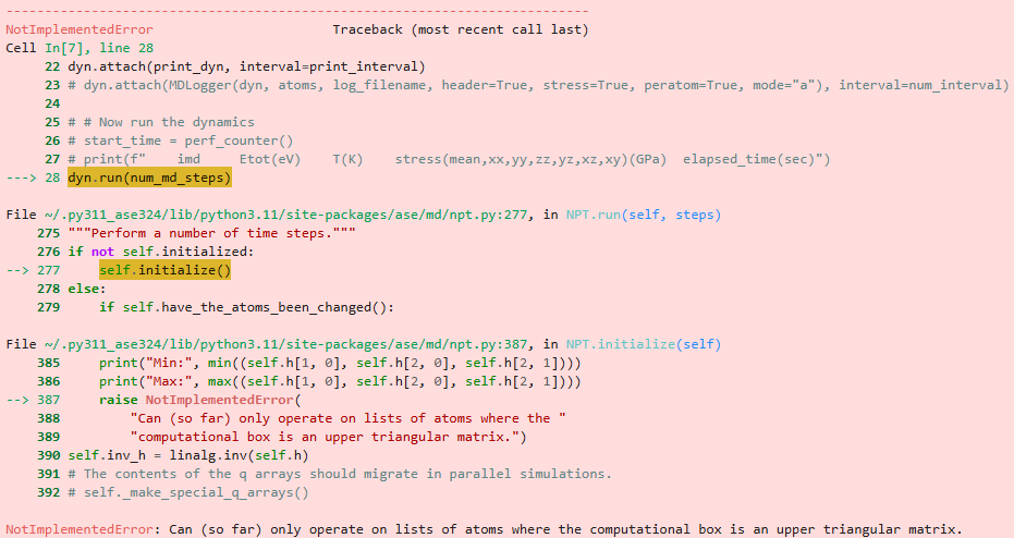 [7.22, 7.22, 0. ]])このようなatomsオブジェクトに対して、格子ベクトルの変換を行わずにNPT-MDを実施しようとすると、以下のようなエラー(NotImplementedError)が出てMD計算が進行しません。