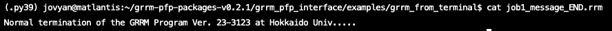 計算が正常終了すると、入力ファイル名に応じた複数の出力ファイルが生成されます。job1.com の場合、job1_message_END.rrm の中に次のように「Normal termination of the GRRM Program Ver. 23-3123 at Hokkaido Univ....」と出力されています。