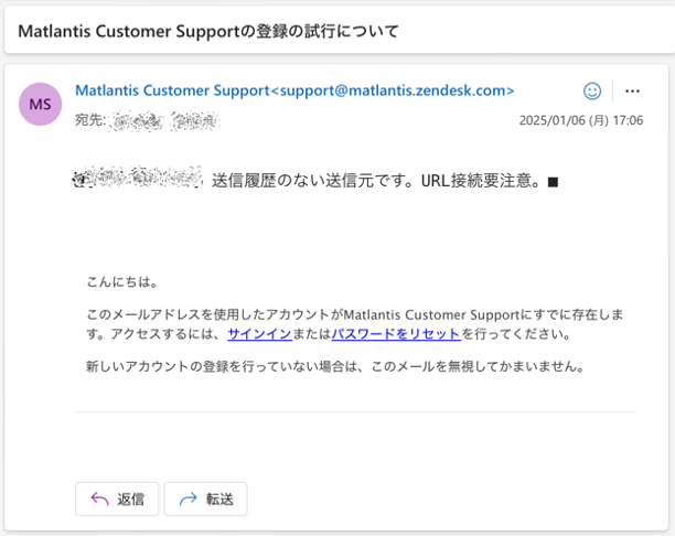 - すでにアカウント登録済みの場合、以下のようなメールが届きます。パスワードを設定した覚えがない場合もパスワードのリセットからパスワードを設定してください。