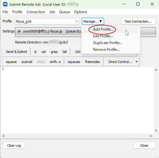 ツール> リモートジョブ投入で「Submit Remote Job」画面を開き、Manage > Add Profile で プロファイルを設定します。