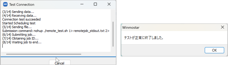 「Test Connection」で「SSH接続とジョブスケジューラとLAMMPS」を選択して「OK」で接続に問題がないか確認してください。