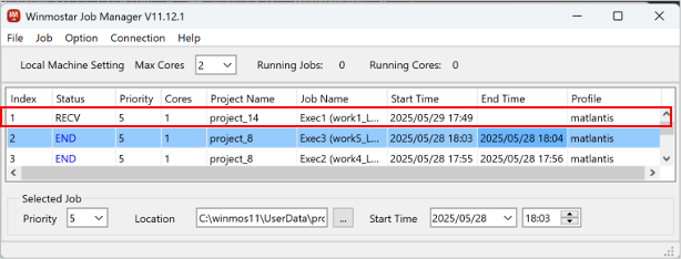 - Winmostar Job Manager の 一番上にいま実行したジョブが表示されます。
