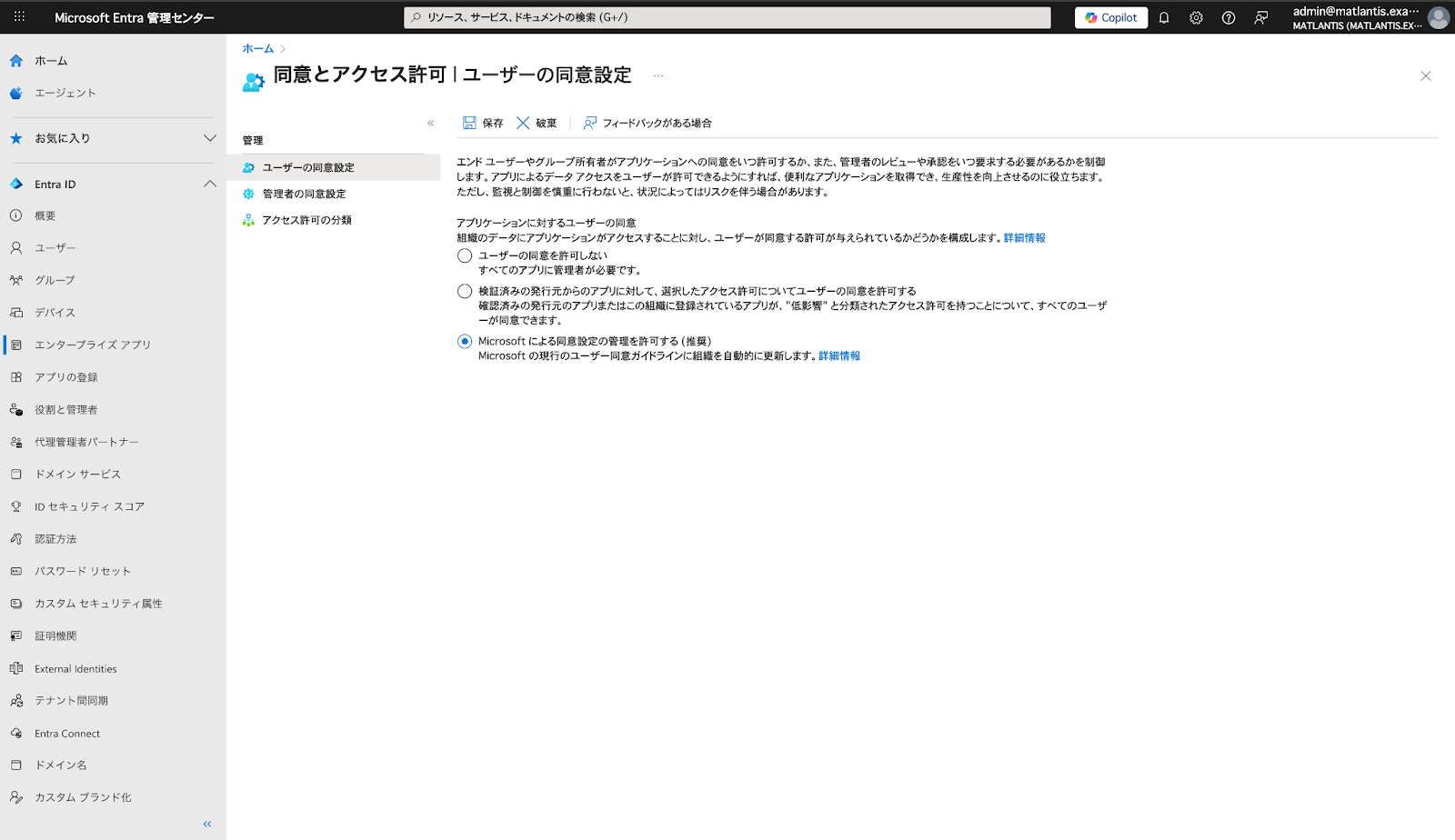 Microsoft Entra admin center のサイドバーから、エンタープライズアプリ > 同意とアクセス許可 > ユーザーの同意設定を確認します。