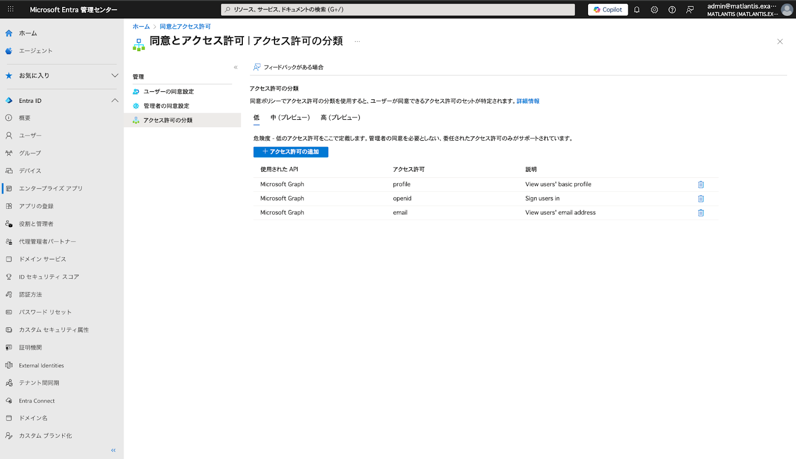 エンタープライズアプリ > 同意とアクセス許可 > アクセス許可の分類を確認します。