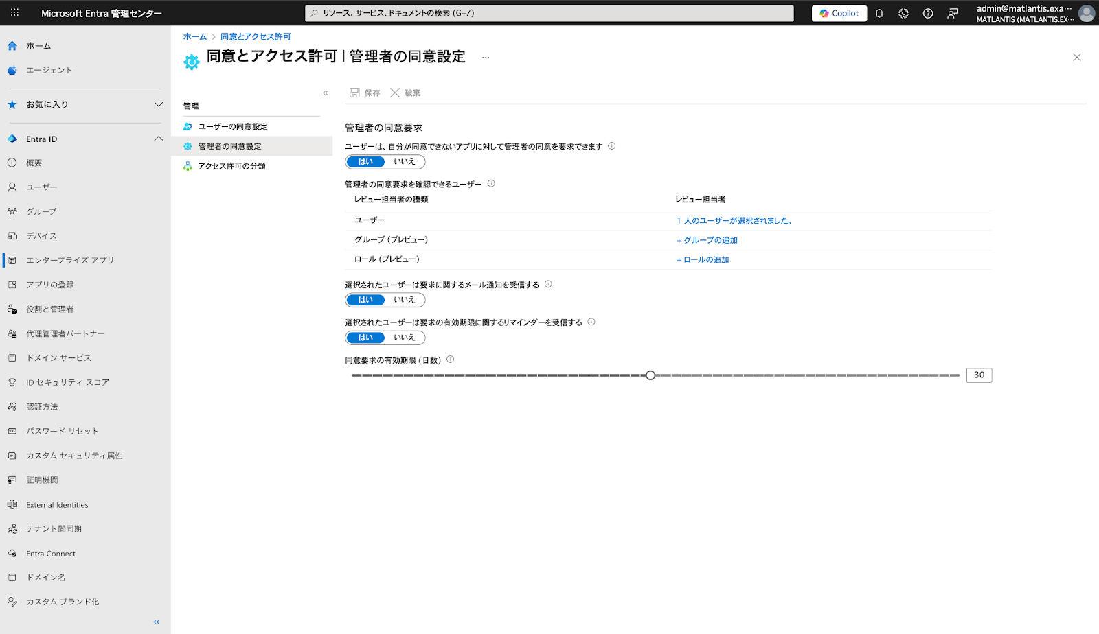 エンタープライズアプリ > 同意とアクセス許可 > 管理者の同意設定を確認します。