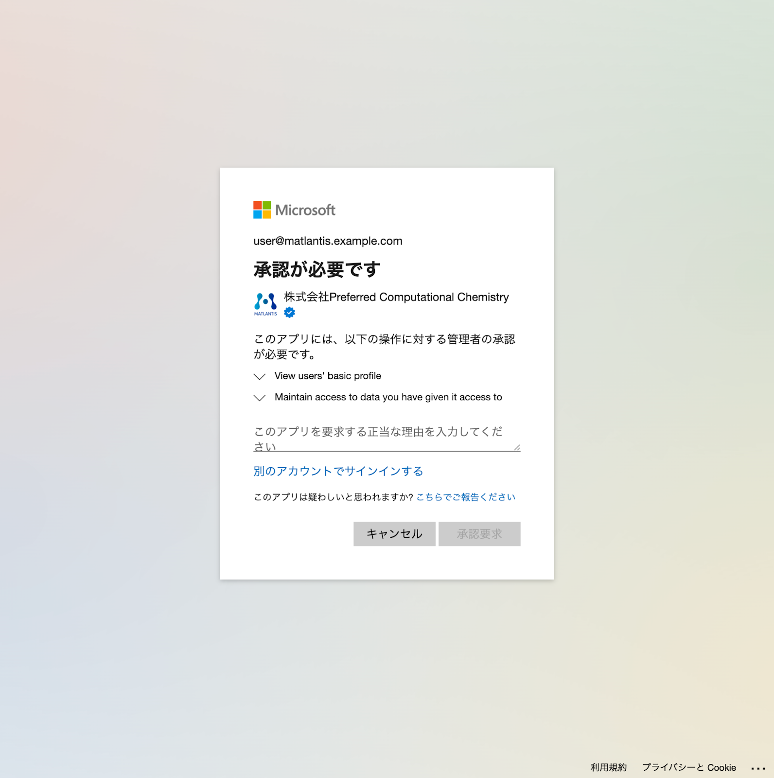 Matlantis 利用者の方は、サインアップ時に以下のような画面が表示されます。[このアプリで必要なアクセス許可] 一覧を確認して、問題ない場合は理由を入力して [承認要求] を押してください。