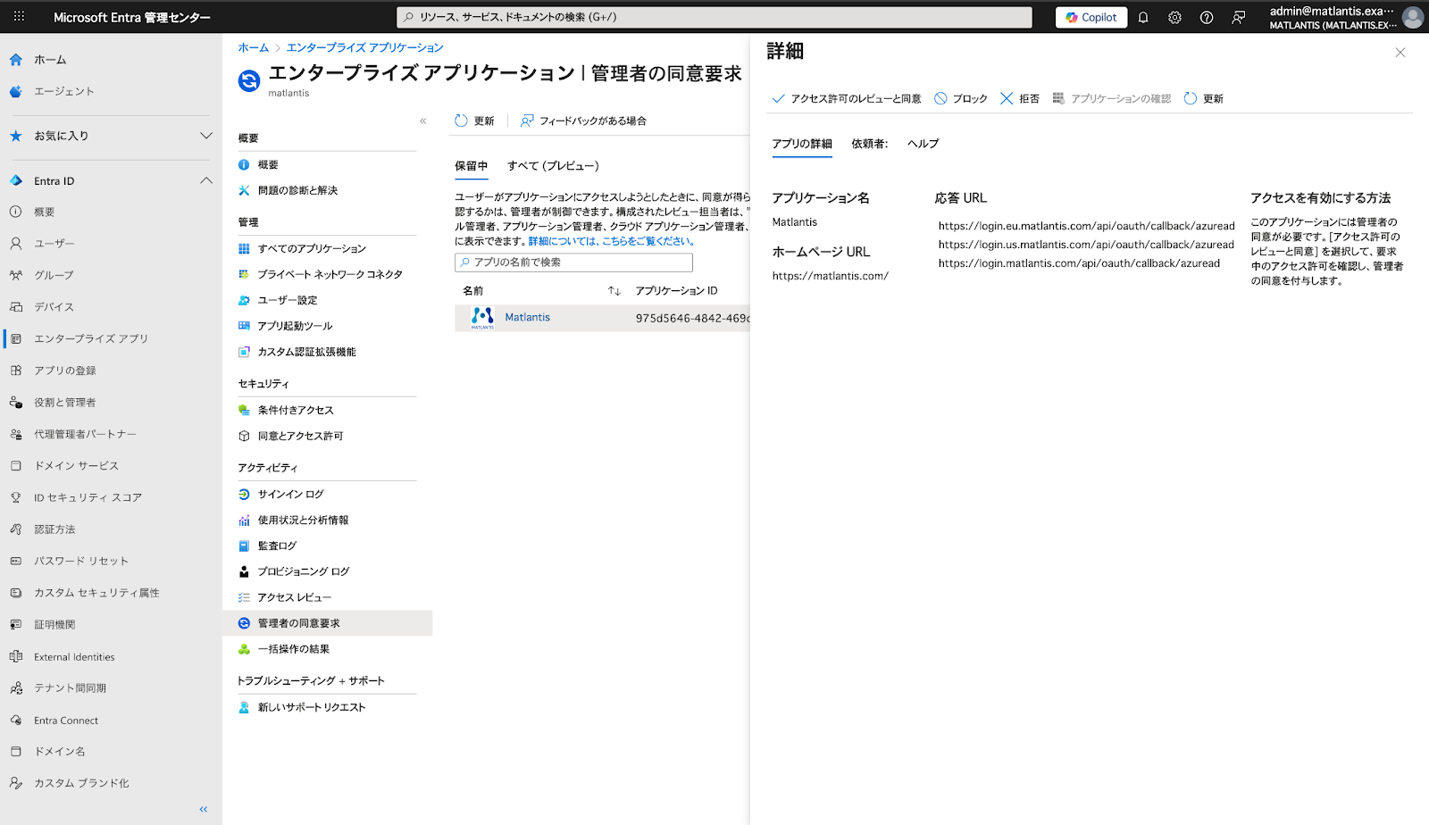 Matlantis を選択し、[アクセス許可のレビューと同意] を選択して、管理者の同意を行ってください。