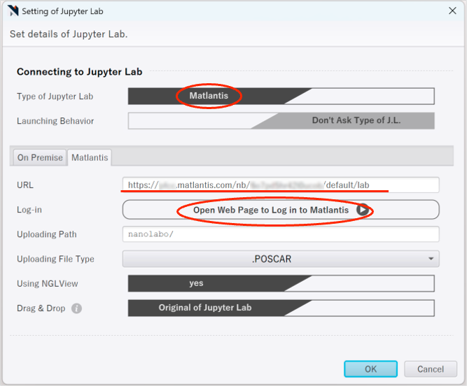 URL は ブラウザでMatlantisのノートブック環境を開いたときのものを取得します。(Dashboard画面のURLではありません)。URL の /lab 以降は不要です。