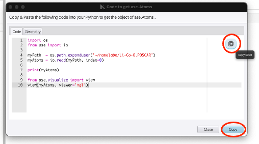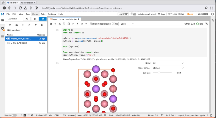 クリックすると、Matlantisの画面に切り替わり、POSCAR形式で構造がアップロードされ、Atomsとして読み込み、nglviewとして描画するためのコードが表示されます。